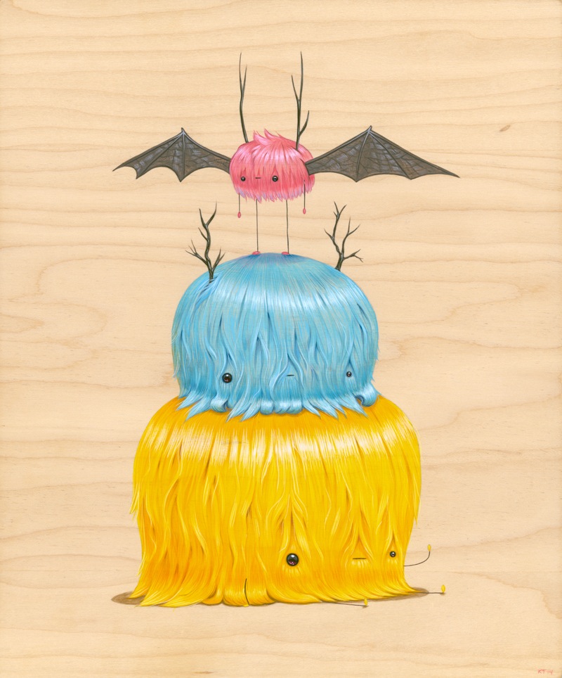 But after 3 and a half years of sewing the same patterns over and over again in my spare time, I felt the need to expand my set of characters. I decided to put away my sewing machine and pick up a paintbrush. I had taught myself how to paint when I was eleven and it’s been a constant calling. No longer limited by the constraints of plush design, the range of Cuddly characters quickly grew to include food, real and imaginary animals, and charming botanicals. Again, I consider myself lucky that my paintings have been featured on top design and food blogs like Moco Loco, Super Punch and Eat Me Daily and exhibited in shows from artKitchen in Amsterdam to Gallery Nucleus in California to La Gaîté Lyrique museum in Paris.