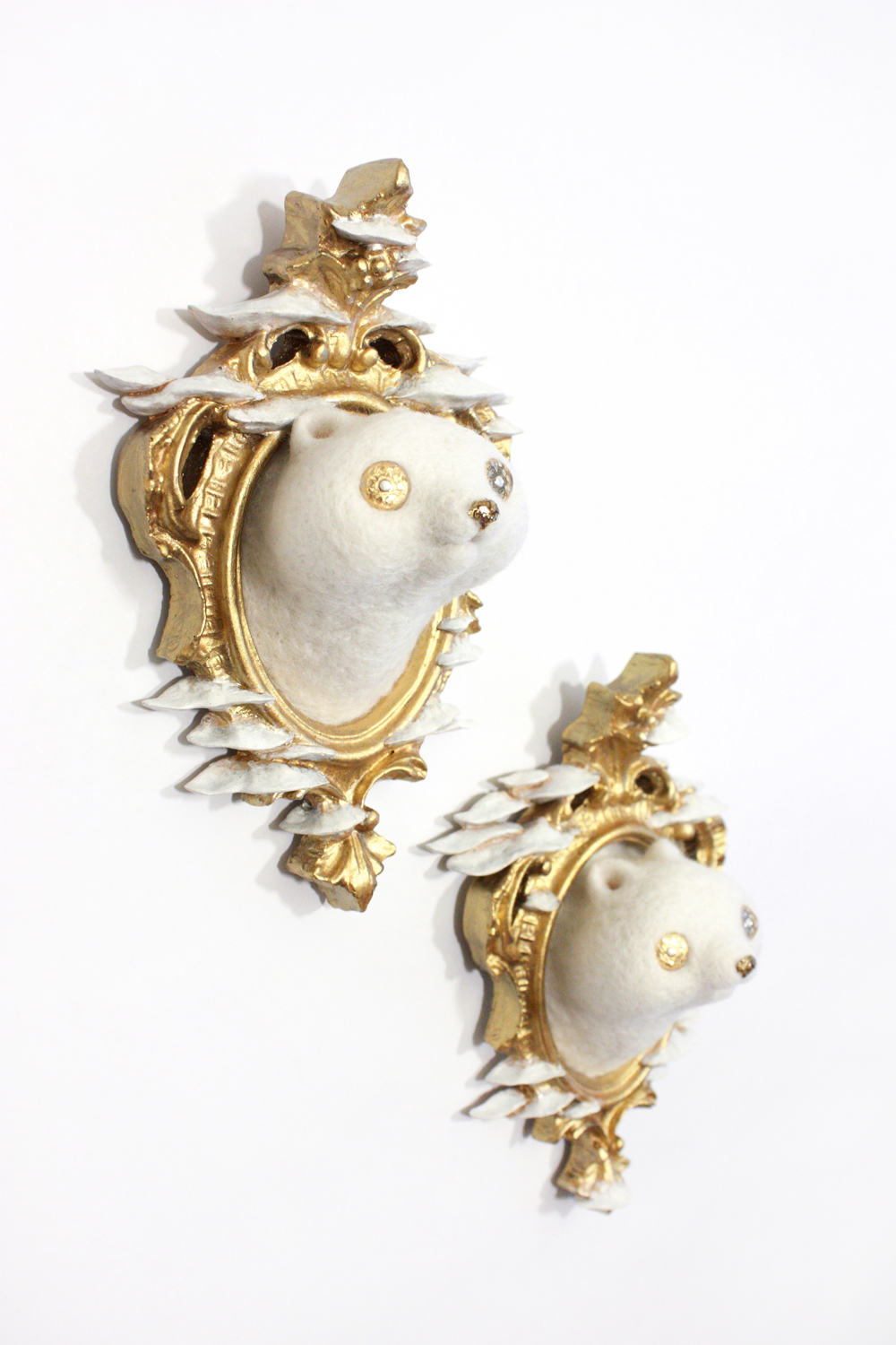 “Zoë Williams creates needle felted wool creatures that act as spirit guides. Inspired by dreams, visions, and the collective unconscious, her unique sculptures capture the imagination and inspire the dreamer in all of us. Her work for this exhibition, Tanuki I & II, as two raccoon dogs that have a comforting presence in their impressive gilded frames. Sure to watch over any who reside below them, these skillfully made companions fulfill their task of navigating the sacred with endearing determination.” – from Press Release of current show Wild Heart by Emiko Woods for Flower Pepper Gallery